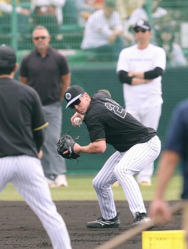 阪神ウィリアムス駐米スカウト(左)藤川監督の見守る中、早出ノックを受けるディバイニー(撮影・上田博志)阪神で救援投手として活躍したジェフ・ウィリアムス駐米スカウト(53)が15日、阪神の沖縄・宜野座キャンプを訪問した。全体練習開始前はメイングラウンドに姿を見せ、大山悠輔内野手(31)、中野拓夢内野手(29)、キャム・ディベイニー内野手(28=パイレーツ)の早出特守を見守った。