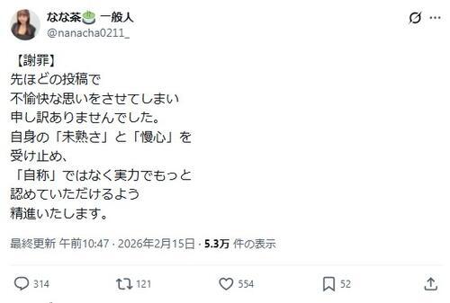 15日、「【謝罪】先ほどの投稿で 不愉快な思いをさせてしまい 申し訳ありませんでした。自身の『未熟さ』と『慢心』を受け止め、『自称』ではなく実力でもっと認めていただけるよう精進いたします」とポスト。当該ポストについて削除した。また、この日までにアカウント名は「なな茶 一般人」に変更されていた。