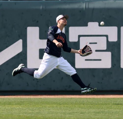 侍ジャパン佐藤輝明内野手(26)が15日、フリー打撃の打球捕球練習で右翼を守った。