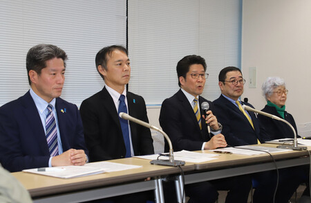 記者会見する家族会代表の横田拓也さん(中央)ら=15日午後、東京都港区