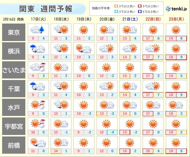 関東地方は、今日16日(月)は夜は雨や雪の降る所があるでしょう。路面状態の変化にご注意ください。明日17日(火)はグッと寒くなり、最高気温は10℃前後となるでしょう。この先は晴れる日が続き、21日(土)からの3連休は再び暖かくなりそうです。寒暖差が大きくなりますので、体調管理にご注意ください。