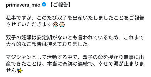 続けて「旦那さんの温かいサポートにも支えられ、穏やかで幸せな妊娠期間を過ごすことができました」と、夫で3人組バンドCYANOTYPE(シアノタイプ)のベーシスト西間木陽にも感謝。「現在は、不慣れながらも可愛すぎる天使たちに囲まれ、幸せな毎日を過ごしています」と近況をつづり、「これからも母として、そしてマジシャンとして、より一層頑張っていきますので、温かく見守っていただけたら嬉しいです。また皆様の前でマジックをお届けできる日を楽しみにしています」と呼びかけた。