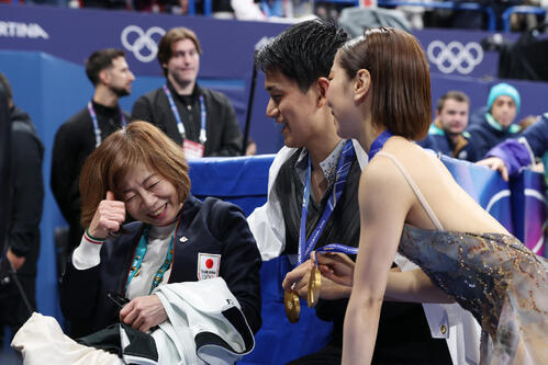 金メダルが決まった三浦と木原と、キス・アンド・クライの下で抱き合った人がいた。