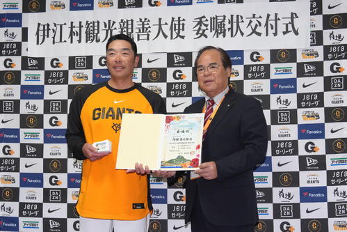 5期目となる任期は2年。「もうずっと伊江村にはお世話になっています。うちの松本剛も伊江村で自主トレをやらせていただいてます。これからも伊江村の発展のために協力していけたらなと思ってます。遠い伊江村からジャイアンツを応援していただいて、僕も伊江村をどんどん宣伝していこうかなと思います」と感謝を述べた。