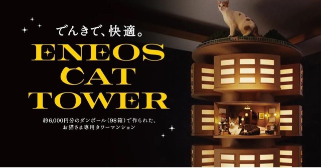 同社が展開する「新生活乗り換えキャンペーン」では、ENEOSでんきへの新規申し込みで電気料金が最大6,000円割引となることをアピールしている。今回の企画では、1箱60.8円のダンボール98箱、割引額相当の約6,000円分相当を使用し、高さ2.3m/幅1.5mの猫専用タワーマンションを制作したという。