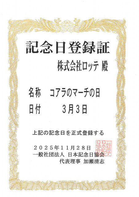 ロッテが18日、ロングセラー菓子「コアラのマーチ」において、3月3日が「コアラのマーチの日」として制定されたことを発表。日本記念日協会の「記念日登録証」を公開した。
