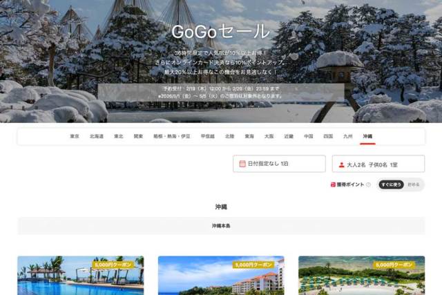LINEヤフーは、旅行予約サイト「Yahoo!トラベル(ヤフートラベル)」で、「GoGoセール」を2月19日正午から20日まで開催している。