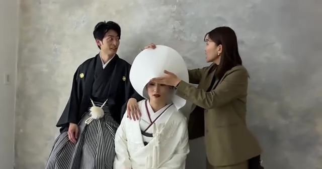 白無垢姿の新婦がかぶっているのは、和装の定番である綿帽子。スタッフが「てってれ〜」と声をかけながらその帽子を外すと……? そこには綿帽子を支えるワイヤー状の土台と、きりっと整えられたヘアスタイルが現れました。ワイヤーは扇のような形になっており、なかなかの存在感。綿帽子の内側の謎が分かる、貴重な場面ですね。