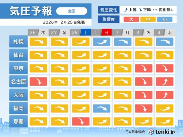 ÌÀÆü26Æü(ÌÚ)¤âÁ´¹ñŪ¤Ëµ¤°µ¤¬²¼¤¬¤ê¡¢±Æ¶ÁÅÙ¤¬Â礭¤¤½ê¤â¤¢¤ë¤Ç¤·¤ç¤¦¡£µ¤°µ¤ÎÊѲ½¤ÇÂÎÄ´¤òÊø¤·¤ä¤¹¤¤Êý¤Ï¡¢Æ¬ÄˤʤɤËÃí°Õ¤¬É¬ÍפǤ¹¡£ÌÀ¸åÆü27Æü(¶â)°Ê¹ß¤âÄ㵤°µ¤È¹âµ¤°µ¤¬¸ò¸ß¤ËÄ̤뤿¤á¡¢µ¤°µ¤Ï¥¢¥Ã¥×¥À¥¦¥ó¤ò·«¤êÊÖ¤¹¤Ç¤·¤ç¤¦¡£3·î3Æü(²Ð)¡Á4Æü(¿å)¤Ï¡¢¹­¤¤ÈϰϤDZƶÁÅÙ¤¬Â礭¤¯¤Ê¤ê¤½¤¦¤Ç¤¹¡£