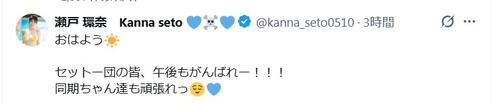 瀬戸の投稿に対し「奇跡の瞬間の1枚ですねw元気いっぱいで可愛いです」「このハイキックと笑顔ヤバすぎて朝から心臓持ってかれたわ」「天才の画角」「セトカンファンはセットー団言うんか」「ラッキーすけべ頂きました」などと書き込まれていた。