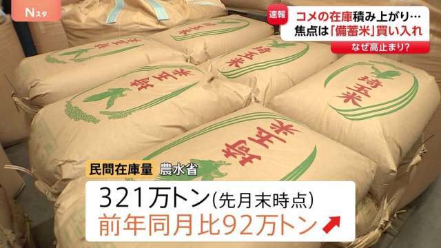 倉庫内は行き場をなくしたコメが積み上がっています。先ほど発表された民間在庫の水準は前の年より92万トン多く、「だぶつき」が鮮明です。