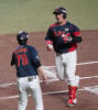 この写真は、ストイックな黒のセットアップのインナーとして、ライムグリーンを差し色にしたコーディネートです。黒の面積が大きいため、ライムグリーンの派手さが程よく抑えられ、派手なのに品がある絶妙なバランスに。Tシャツは少し光沢のある素材なので、マットな質感のセットアップに奥行きが出ています。