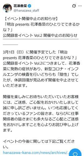 「『明治presents 花澤香菜のひとりでできるかな?』公開録音イベントVol.2開催中止のお知らせ」とし、「3月1日(日)に開催予定でした『明治presents 花澤香菜のひとりでできるかな?』公開録音イベントVol.2につきまして、花澤香菜に発熱の症状があり、新型コロナ・インフルエンザの検査を行いどちらも『陰性』でしたが、体調回復が見込めず開催を中止させていただきます」と発表した。
