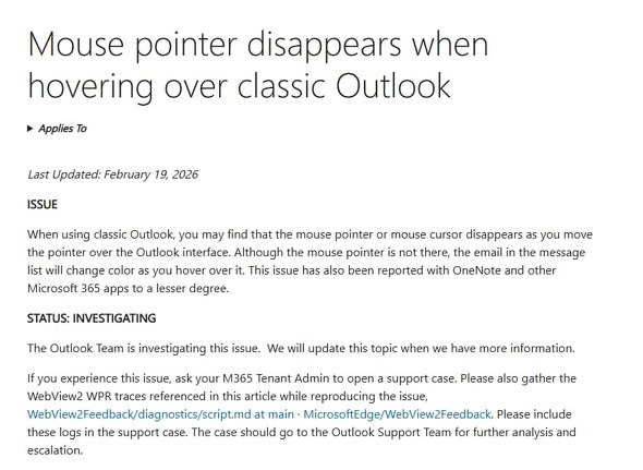 ¡¡Microsoft¤Ï2·î19Æü¡¢¥¯¥é¥·¥Ã¥¯ÈǤÎOutlook¤ò»ÈÍÑÃæ¤Ë¥Þ¥¦¥¹¥Ý¥¤¥ó¥¿¡¼¤¬¾Ã¤¨¤ëÉÔ¶ñ¹ç¤¬È¯À¸¤·¤Æ¤¤¤ë¤È¥µ¥Ý¡¼¥È¥Ú¡¼¥¸¤ÇÌÀ¤é¤«¤Ë¤·¤¿¡£