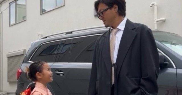 「ヤンチャでごめんなさい」「せっかくだから着物脱ぐ前に」とコメントが添えられ投稿された動画は、夫妻の娘ちゃんの、七五三での一幕。ERIKAさんが7歳のときに着たものだという、桃色のかわいらしい着物で華やかに装った娘ちゃんは、格好良くスーツでキメたパパと向かい合って笑っています。