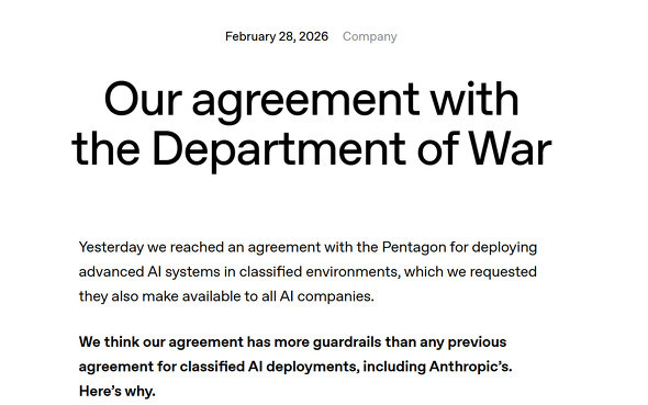 ¡¡ÊÆOpenAI¤Î¥µ¥à¡¦¥¢¥ë¥È¥Þ¥óCEO¤Ï2·î27Æü¡Ê¸½ÃÏ»þ´Ö¡Ë¡¢ÊƹñËÉÁí¾Ê¡ÊDepartment of War¡¢°Ê²¼¡ÖDoW¡×¡Ë¤Îµ¡Ì©¥Í¥Ã¥È¥ï¡¼¥¯¤ËƱ¼Ò¤ÎAI¥â¥Ç¥ë¤òƳÆþ¤¹¤ë·ÀÌó¤Ç¹ç°Õ¤·¤¿¤È¡¢¼«¿È¤ÎX¥¢¥«¥¦¥ó¥È¤Çȯɽ¤·¤¿¡£¥É¥Ê¥ë¥É¡¦¥È¥é¥ó¥×ÊÆÂçÅýÎΤ¬OpenAI¶¥¹ç¤ÎÊÆAnthropicÀ½ÉʤÎDoW¤Ç¤Î»ÈÍÑÄä»ß¤òȯɽ¤·¤¿¤ï¤º¤«¿ô»þ´Ö¸å¤À¤Ã¤¿¡£Íâ28Æü¤Ë¤ÏƱ¼Ò¸ø¼°¥Ö¥í¥°¤Ç¤â¾ÜºÙ¤Ê¹ç°ÕÆâÍÆ¤È¸«²ò¤ò¸ø³«¤·¤¿¡£