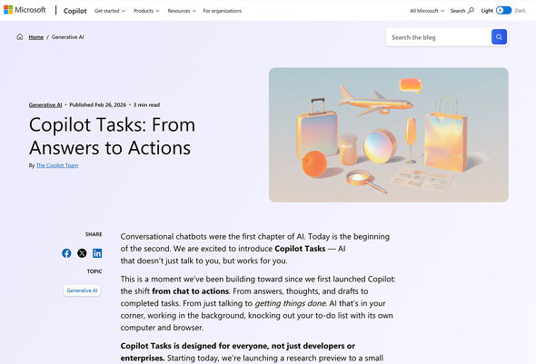 Microsoftは2月26日(米国時間)、複数のアプリやサービスをまたいで特定の手順に沿ってタスクを実行する「Copilot Tasks」を発表した。
