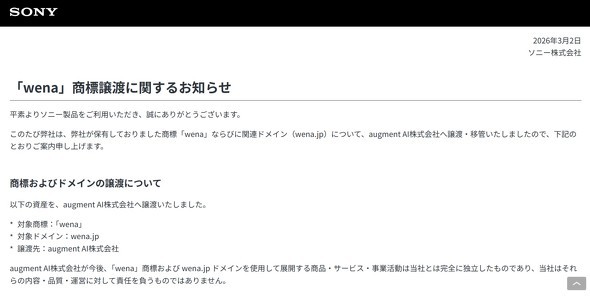 ソニーは2026年3月2日、スマートウォッチブランド「wena」に関する商標およびドメインを、augment AIへ譲渡したと発表した。augment AIが今後、wena商標およびwena.jpドメインを使用して展開する商品・サービス、事業活動、内容、品質、運営について、ソニーは責任を負わないとしている。
