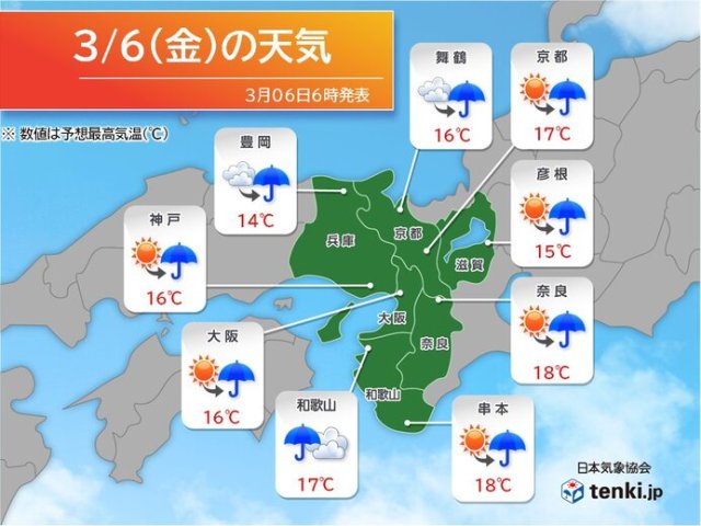 今日6日の近畿地方は、天気が下り坂へ向かう見込みです。午前中は晴れ間が出る所もありますが、午後は寒冷前線の接近に伴い西から次第に雨が降り出すでしょう。夜は広い範囲での雨となり、雷を伴って雨脚が強まる所もありそうです。