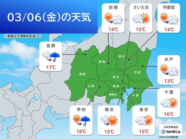 関東地方は日差しが届きますが、昨日(5日)と比べると雲が広がりやすいでしょう。午後3時以降は所々で雨が降りそうです。神奈川県や千葉県、茨城県では、大気の状態が次第に不安定になり、局地的に雷雨となるでしょう。落雷や突風、急に強まる雨に注意が必要です。