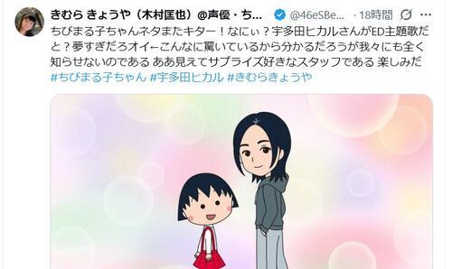 アニメ「ちびまる子ちゃん」のナレーションなどで知られる声優でナレーターきむらきょうや(木村匡也)が6日までにXを更新。同アニメの新エンディング主題歌を歌手の宇多田ヒカルが担当するとの報道に驚きをつづった。