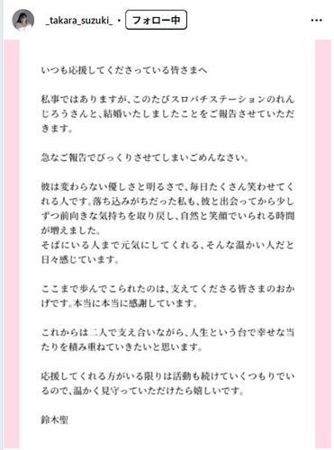 グラビアアイドルでタレントの鈴木聖(たから、25)が6日、自身のインスタグラムを更新。パチンコ・パチスロ専門情報サイト「スロパチステーション」のライターでYouTubeチャンネル「すろぱちすてぇしょん」でも人気の、れんじろうと結婚したことを公表した。
