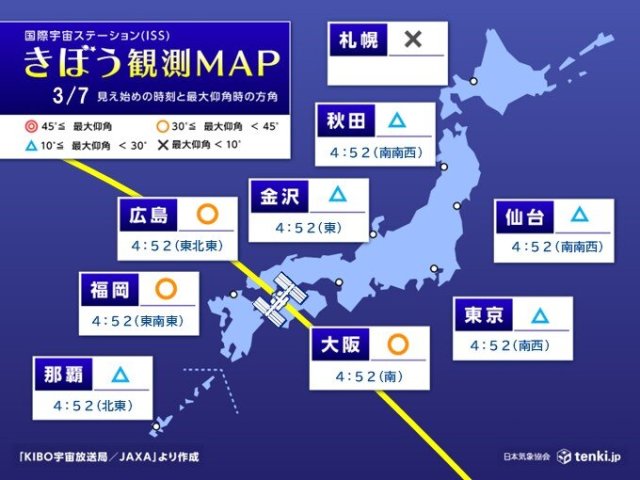 À¾ÆüËܤòÃæ¿´¤Ë´Ñ¬¤Î¥Á¥ã¥ó¥¹¤¬¤¢¤ê¡¢Âçºå¤ä¹Å硢ʡ²¬¤Ê¤É¤Ç¤ÏÈæ³ÓŪ¸«¤Ä¤±¤ä¤¹¤¤¤Ç¤·¤ç¤¦¡£ÅìÆüËܤǤϤä¤ä¾ò·ï¤¬Îô¤ë¤â¤Î¤Î¡¢Å·µ¤¼¡Âè¤Ç¤Ï´Ñ»¡¤Ç¤¤ë²ÄǽÀ¤¬¤¢¤ê¤Þ¤¹¡£¤¿¤À¡¢º£²ó¤ÎÄ̲á¤Ç¤ÏISS¤Î¹âÅÙ¤¬¤½¤ì¤Û¤É¹â¤¯¤Ê¤é¤Ê¤¤Ãϰè¤â¤¢¤ê¤Þ¤¹¡£·úʪ¤ä»³¤Ê¤É¤Ë¼×¤é¤ì¤Ê¤¤¤è¤¦¡¢¶õ¤¬¹¤¯¸«ÅϤ»¤ë¾ì½ê¤Ç´Ñ»¡¤¹¤ë¤È¸«¤Ä¤±¤ä¤¹¤¯¤Ê¤ë¤Ç¤·¤ç¤¦¡£