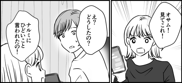 私はオサムが帰宅するなり、すぐにナルミに言われたことを話しました。私は怒りに震える手で、スマホをオサムに差し出しました。オサムは私のスマホを受け取ると、画面をまじまじと見ました。オサムがこれまでのトーク履歴も見たいと言うので了承します。別に見られて困るようなことは送っていないので。