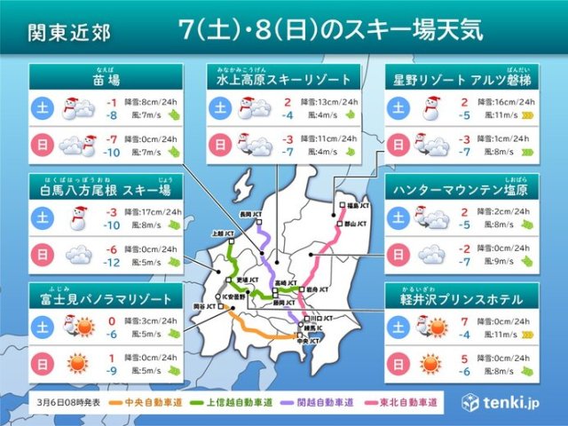 8日(日)は冬型が次第に緩みますが、寒気の影響が残り、雲が広がりやすいでしょう。長野県や群馬県のスキー場では雪や曇りの天気となり、厳しい冷え込みが続きそうです。苗場では最低気温がマイナス10度前後まで下がる予想となっています。一方、富士見パノラマリゾートや軽井沢プリンスホテルスキー場では日差しが届く時間もありそうです。