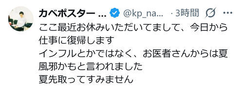 お笑いコンビ、カベポスターの永見大吾(36)が6日、自身のXを更新。体調不良から復帰したと明かした。
