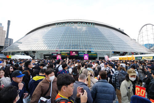 試合開始が近づくにつれ、東京ドーム周辺の熱気も増した。試合開始の数時間前から2カ所のグッズショップはどちらも長蛇の列。何重にも折り重なった列は、時間を追うごとにどんどん伸びていった。あまりの長さに、思わずスマホで写真撮影する人も。東京ドームシティ内「Gallery AaMo」のショップでは入場制限もかかっていた。