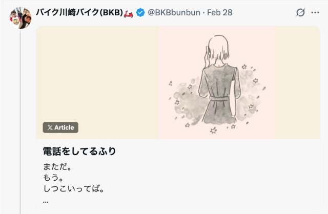 ¡¡¤½¤ó¤ÊÂåɽºî¤ÎɽÂêºî¡ÖÅÅÏäò¤·¤Æ¤ë¤Õ¤ê¡×¤ò¡¢2·î28Æü¤Ë¼«¿È¤ÎX¡Ê@BKBbunbun¡Ë¤Ç²þ¤á¤ÆÅê¹Æ¡£¥Ê¥ó¥Ñ¤µ¤ì¤ä¤¹¤¤¡È»ä¡É¤¬¡¢Éã¿Æ¤ÈÅÅÏ䷤Ƥ¤¤ë¤Õ¤ê¤ò¤·¤Æ¤½¤Î¾ì¤ò¤ä¤ê²á¤´¤½¤¦¤È¤¹¤ë——¤½¤³¤«¤é»Ï¤Þ¤ë¿ôʬ¤ÇÆÉ¤á¤ëʪ¸ì¤¬¡¢Â¿¤¯¤Î¿Í¤ÎÎÞÁ£¤òľ·â¤·¤¿¡£Åê¹Æ¤Ï½Ö¤¯´Ö¤Ë³È»¶¤µ¤ì¡¢Â¿¤¯¤ÎÃøÌ¾¿Í¤âÈ¿±þ¤·¤¿¡£