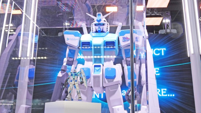 「hololive SUPER EXPO 2026」の「ガンダムシリーズ×ホロライブプロダクション」ブースに訪れると、そこにはホロライブカラーにペイントされた人間サイズのガンダム立像、参考展示品の数々、そしてプロジェクトのプロモーションムービーがあり、ブースの各所で来場者の熱視線を集めていました。
