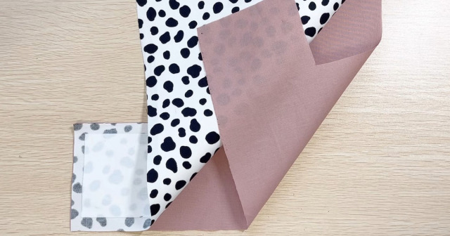 次はカードポケットを作ります。まずはダルメシアン柄の生地を半分に折って縫い合わせます。これをくすみピンクの生地の上にのせてコの字型に縫い、さらに中心部分を縫います。これでカードポケットの部分ができました。