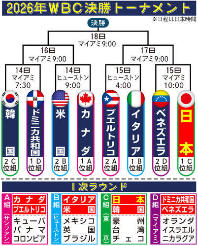 準々決勝は日本時間の14、15日に米マイアミ、ヒューストンで行われる。日本の試合は同15日10時開始。