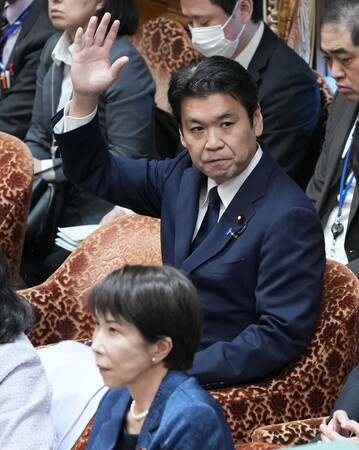 衆院予算委員会で挙手する松本洋平文部科学相(奥)。手前は高市早苗首相=12日、国会内 高市早苗首相は12日の衆院予算委員会で、不倫疑惑を報じられた松本洋平文部科学相を続投させる意向を示した。「文科行政のスペシャリストとして就任をお願いした。一生懸命に職責を果たしてほしい」と語った。中道改革連合の早稲田夕季副代表が首相の任命責任をただしたのに対して答えた。