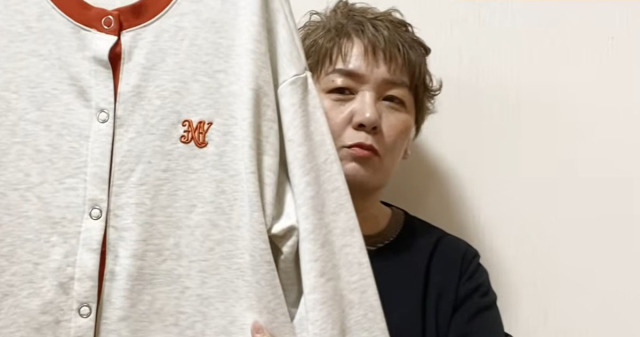 今回の購入品は田中里奈さんプロデュースの配色カーディガン(税込1639円)です。スウェットタイプのカーディガンはシルバーボタンで前開き。色は薄いグレーで、胸元の刺しゅうロゴと首回りや袖口にはキレイなオレンジ色が使われています。今回はこのカーディガンで3種類のコーディネートを紹介してくれます。
