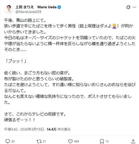 ¸µÆüËܥƥì¥Ó¥¢¥Ê¥¦¥ó¥µ¡¼¤Ç¥¿¥ì¥ó¥È¤Î¾åÅĤޤꤨ¡Ê39¡Ë¤¬19Æü¡¢X¤ò¹¹¿·¡£Ï©¾åµÊ±ìÃËÀ¤¬¤¹¤ì°ã¤¤¤¶¤Þ¡¢¿¬¤«¤é¡ÉÇËÎö²»¡É¤òȯ¤·¤¿½ÐÍè»ö¤ò¤Ä¤Å¤Ã¤¿¡£