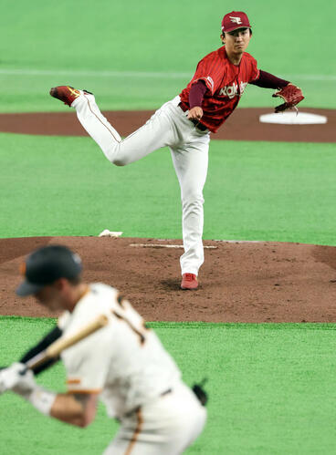 巨人対楽天 1回裏巨人の攻撃で力投する楽天先発の荘司。打者キャベッジ(撮影・浅見桂子)