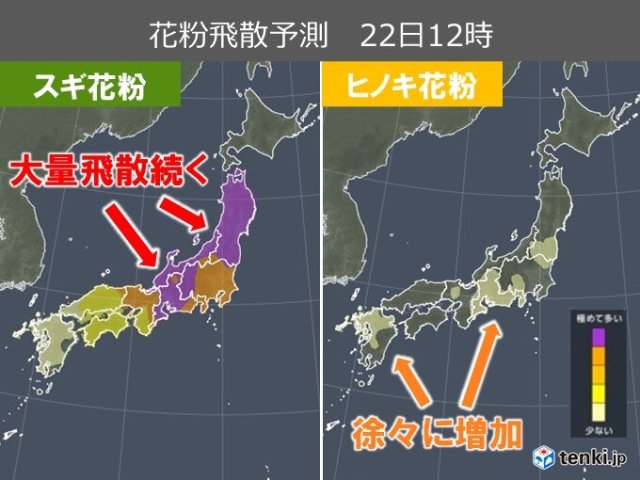 スギ花粉の最盛期が続いている東北・北陸・東海は、明日22日も晴れて暖かくなる所が多く、花粉の飛散は「極めて多い」予想です。メインがスギ花粉からヒノキ花粉に交代しつつある関東は、明日22日は花粉の飛散が「多い」でしょう。スギ花粉の最盛期を過ぎた西日本は、明日22日は雲が広がりやすく、午後は雨の降る所もあるため、花粉の飛散する量は抑えられる見込みです。ただし、九州を中心にヒノキ花粉が増加している所があるため、ヒノキ花粉にアレルギーのある方は注意が必要です。