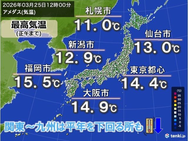 今日25日(水)は九州から東海まで雨雲に覆われ、関東にも雨雲が接近中です。曇りや雨の所ほど気温が上がりにくく、正午までの最高気温は東京都心で14.4℃、大阪市で14.9℃など15℃を下回り、ヒンヤリとした体感となっています。なお、東京都心の最高気温は朝9時台に観測されており、正午現在の気温は12.7℃とさらに低くなっています。
