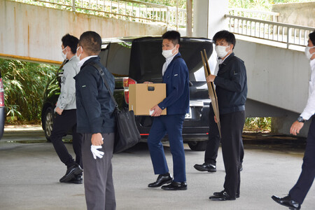 辺野古沖で女子高校生ら2人が死亡した転覆事故で、関係先を家宅捜索した第11管区海上保安本部の職員ら=25日、沖縄県南城市
