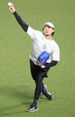 キャッチボールで調整するソフトバンク上沢(撮影・梅根麻紀)