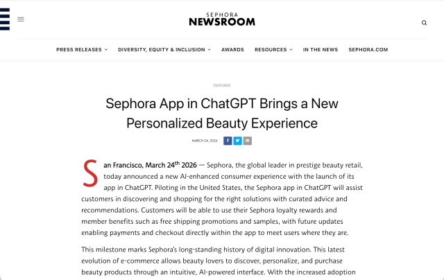 またOpenAIのChatGPT責任者であるニック・ターリー(Nick Turley)氏は「ChatGPTとセフォラのこの新たな取り組みは、ChatGPT内で美容アイテムの発見やショッピングをいかにより有益でパーソナライズされたものにできるかを探求するもの」と述べた。