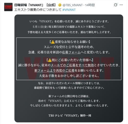 ÇÐÍ¥ºæ²í¿Í¡Ê52¡Ë¼ç±é¤Çº£Ç¯¤ÎÊüÁ÷¤¬Í½Äꤵ¤ì¤ëTBS·Ï¥É¥é¥Þ¡ÖÆüÍË·à¾ì¡¡VIVANT¡×¤Î¸ø¼°X¤¬27Æü¤Þ¤Ç¤Ë¹¹¿·¤µ¤ì¡¢ºë¶Ì¡¦¹ÔÅĻԤ¬Åê¹Æ¤·¤Æ¤¤¤¿¥¨¥¥¹¥È¥éÊ罸¤ÎÊýË¡¤¬Êѹ¹¤µ¤ì¤ë¤³¤È¤¬¼Õºáʸ¤È¤È¤â¤ËÅÁ¤¨¤é¤ì¤¿¡£Åö½é¤Î¥á¡¼¥ë¤Ï±þÊçºÑ¤ß¤Î¤â¤Î¤â̵¸ú¤È¤Ê¤ê¡¢¿·ÀߤαþÊç¥Õ¥©¡¼¥à¤Ø¤ÈÊѹ¹¤µ¤ì¤ë¡£