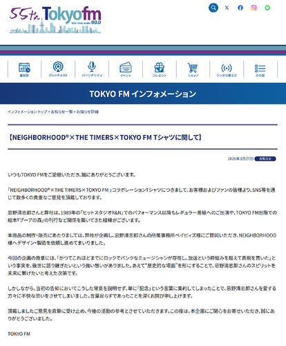 「NEIGHBORHOOD(R)×THE TIMERS×TOKYO FM」コラボレーションTシャツにつきまして、お客様およびファンの皆様より、SNS等を通じて数多くの貴重なご意見を頂戴しております。