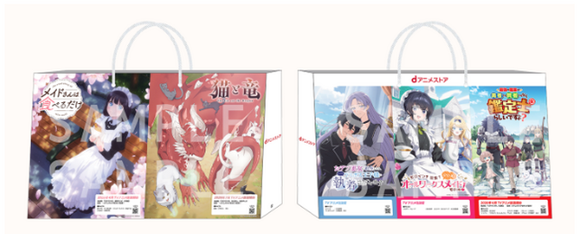 4月5日放送開始の『メイドさんは食べるだけ』をはじめ、TVアニメ化される『猫と竜』『おデブ悪女に転生したら、なぜかラスボス王子様に執着されています』『ヒロイン?聖女?いいえ、オールワークスメイドです(誇)!』『最強の職業は勇者でも賢者でもなく鑑定士(仮)らしいですよ?』の描かれたショッパーを配布。