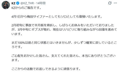 KZ¤Ï¡Ö4·î1Æü¤«¤éÇßÅÄ¥µ¥¤¥Õ¥¡¡¼¤È¤·¤Æ¤â¥½¥í¤È¤·¤Æ¤âÉüµ¢¤¤¤¿¤·¤Þ¤¹¡×¤ÈÊó¹ð¡£¡Ö2·î½é½Ü¤Ë»ö¸Î¤ÇȾ·îÈĤò¹üÀÞ¤·¡¢¤·¤Ð¤é¤¯¤ªµÙ¤ß¤ò¤¤¤¿¤À¤¤¤Æ¤ª¤ê¤Þ¤·¤¿¤¬¡¢3·îÃæ½Ü¤Ë¥®¥×¥¹¤¬¼è¤ì¡¢¸½ºß¤Ï¥ê¥Ï¥Ó¥ê¤Ë¼è¤êÁȤߤʤ¬¤é²óÉü¤ò¿Ê¤á¤Æ¤¤¤Þ¤¹¡£¤Þ¤À100%°ÊÁ°¤ÈƱ¤¸¾õÂ֤ȤϤ¤¤¤Þ¤»¤ó¤¬¡¢¾¯¤·¤º¤Ä³Î¼Â¤ËÌᤷ¤Æ¤¤¤ë¤È¤³¤í¤Ç¤¹¡×¤È¸½¾õ¤òÀâÌÀ¤·¤¿¡£