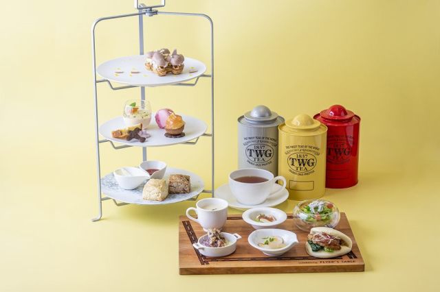スイーツは、グレープフルーツタルト、苺のマカロン、チェリーのギモーヴと飛行機サブレ、アプリコットとミントのヴェリーヌなどで、飛行機シューはノワゼットプラリネのカスタードとレモンクリーム、ノワゼットのキャラメリゼをサンドして仕上げた。「紅茶とグリオットチェリー」と「プレーン」のスコーン2種は、クロテッドクリームと季節のコンフィチュールを添えて提供する。セイボリーは、春キャベツとシラスのカッペリーニサラダ仕立て、旬の新玉ねぎのポタージュ、オレンジソースを合わせた真鯛の昆布締め、バジル香るタルタルソースを合わせたホタルイカのフリット、筍と生ハムのマリネなどを用意する。乾杯用のノンアルコールスパークリングワインに加え、TWG Tea3種とコーヒーやジュース類を含むドリンクバーを利用できる。