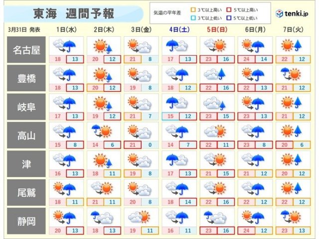 明日4月1日(水)は、今日31日(火)よりも、暖かく湿った空気の流れ込みが、沿岸部や静岡県中心となりそうです。沿岸部や静岡県を中心に、雨量はさらに増える見込みです。低気圧は、東海地方沿岸を通過していくため、2日(木)は未明まで雨の降る所が多いでしょう。2日(木)日中は、広く晴れ間が戻りますが、雨上がりの花粉の大量飛散に注意が必要です。